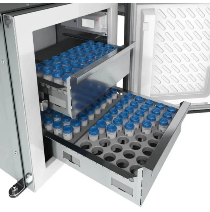 A geladeira Elber para transporte de leite, com 53 litros, foi projetada para ser instalada na plataforma ou no chassi do caminhão com sistema de fixação específico. Além disso, é especialmente fabricada para o transporte de amostras de leite. Dessa forma, ela possui um espaço otimizado para transportar até 96 amostras de 50ml em 3 bandejas ou 24 amostras de 300ml com bandeja única. A geladeira para caminhão de transporte de leite 53 litros é um equipamento resistente e feito para as mais severas condições de trabalho. Aceita inclinações, tolera buracos e solavancos da estrada e suporta contato com sujeira e água (pode ser lavada junto ao caminhão). A estrutura do gabinete e dos componentes forma um conjunto resistente para a aplicação automotiva e para a segurança do usuário com o veículo em movimento. Ligada Diretamente na Bateria do Veículo